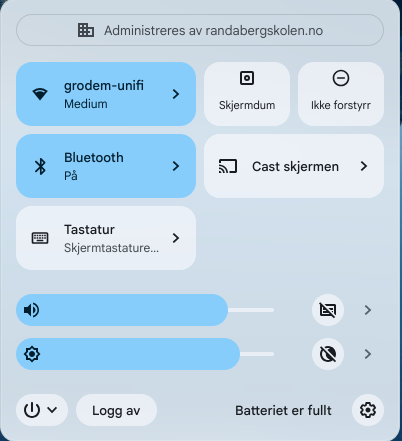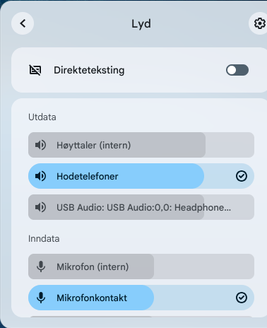 Dersom du har hodetelefoner, høyttalere o.l koblet til Chromebooken din vet ikke Chromebooken på magisk vis hvor du vil ha lyden ut. Her er det jo nemlig flere alternativer å velge mellom. Den velger da det som er mest naturlig. Lyden kommer ut på selve maskinen. Og det passer kanskje deg dårlig som sitter der med hodetelefoner, eller har planer for god gang med lyd ut av høyttalere i klasserommet.